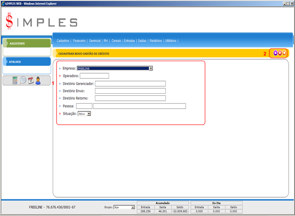 A tela do Cadastro de Cartões de Crédito possui quatro elementos principais que executam funções distintas, conforme seguem: