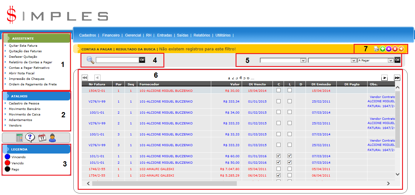 A tela do Contas a Pagar possui sete elementos principais que executam funções distintas, conforme seguem: