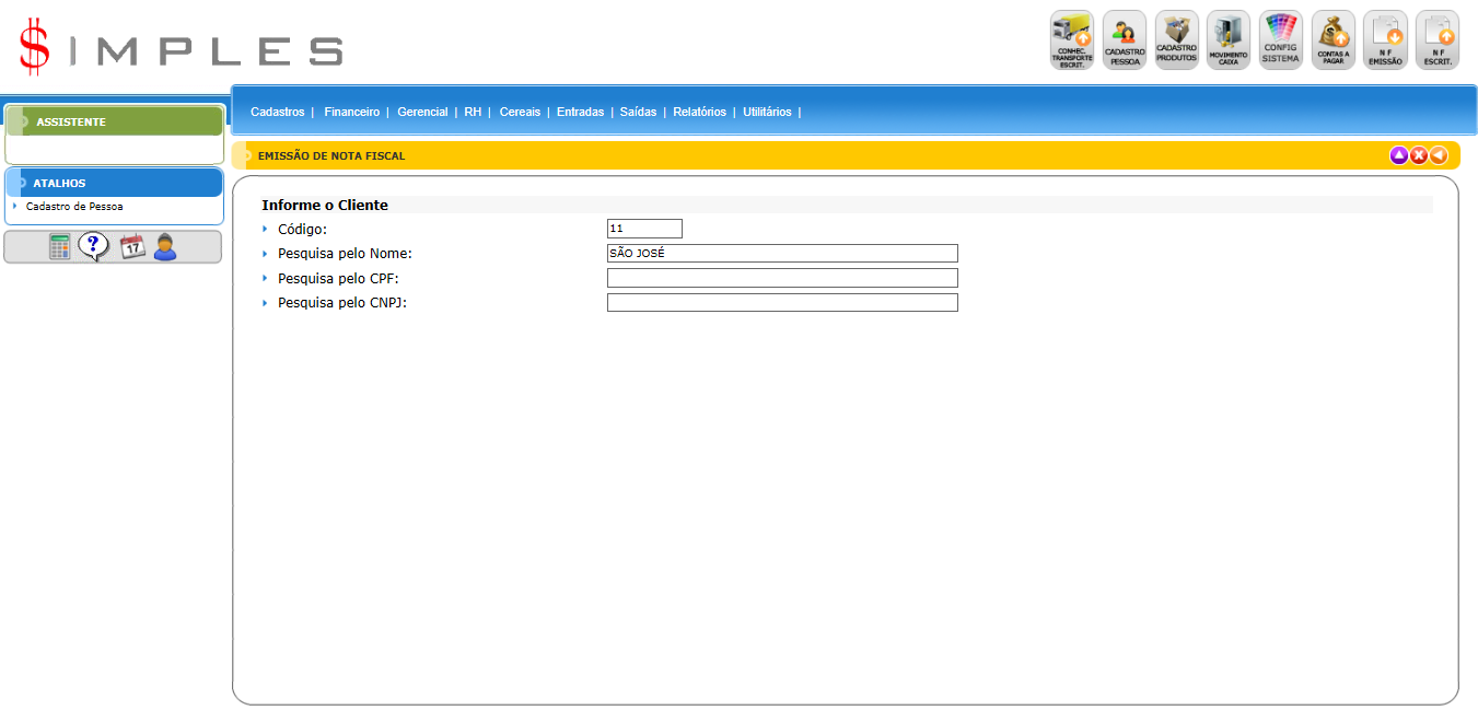 Logo que clicado no botão de incluir na barra de navegação, tem que colocar o cliente.