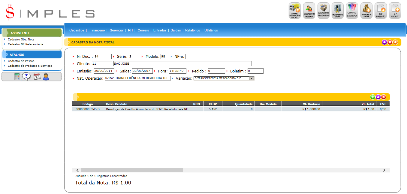 Em seguida após dar o Enter, para confirmar os itens, é só digitar a quantidade e confirmar, logo que confirmado irão aparecer outros campos referentes aos impostos. O sistema irá sugerir os valores, caso não esteja de acordo com os valores que deseja é só alterar.