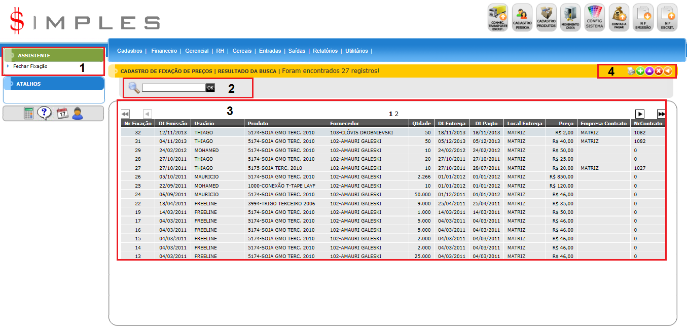 Para acessar Cereais - Fixação de Preços, use o Menu “Cereais – Fixação de Preços”.