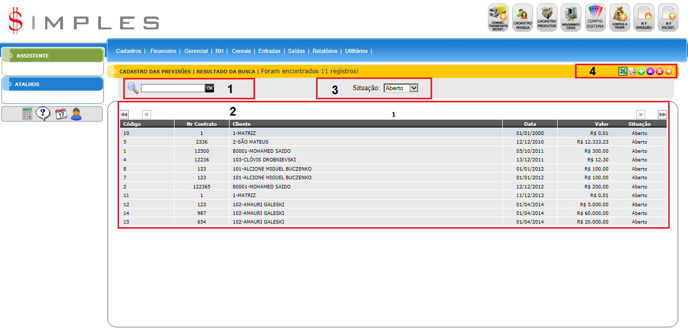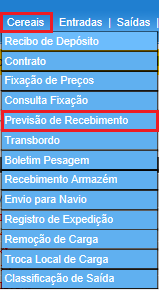 Para acessar Cereais - Previsão de Recebimento , use o Menu “Cereais – Previsão de Recebimento”.