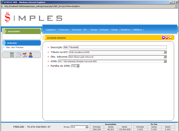 - Atalhos: Permite de forma rápida entrar no cadastro de Obs. dos Tributos.