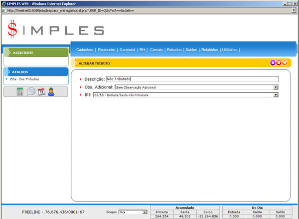 - Atalhos: Permite de forma rápida entrar no cadastro de Obs. dos Tributos.