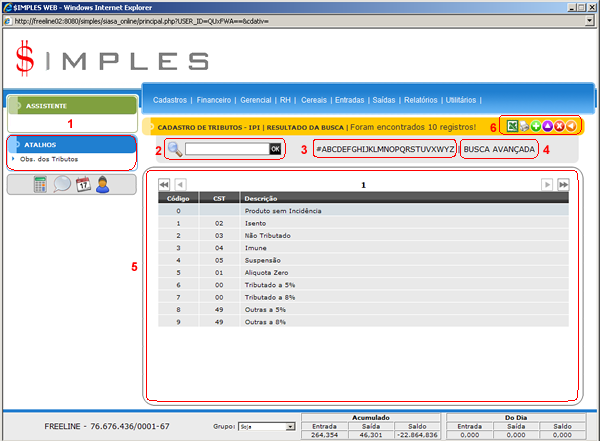 A tela do Cadastro de Tributos do IPI possui seis elementos principais que executam funções distintas, conforme seguem: