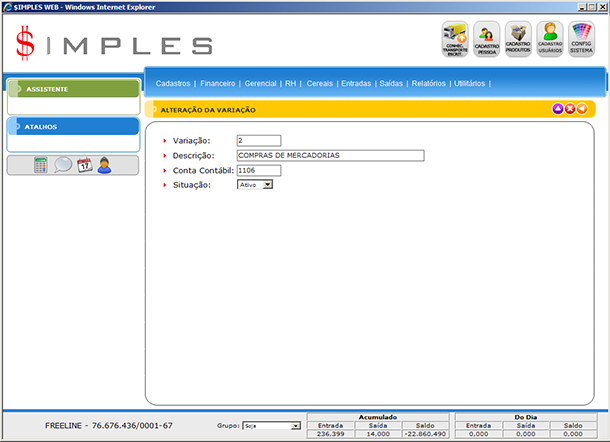 - Navegador: Nesta área se encontram as opções de Incluir, Editar, Deletar, Visualizar Relatório ou Gerar Arquivo Excel, e Sair da Tela.